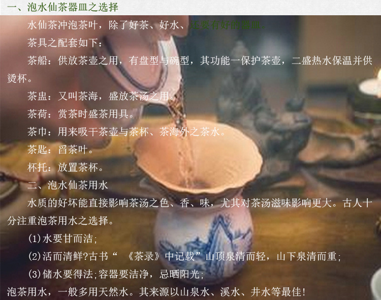 冲泡水仙茶注:水温和茶水量也会影响冲泡时间的高低,如果水温高,请多喝茶,冲泡时间要短一些;否则,冲泡时间应当更长一些。但是,最最主要的是要着眼于适当饮用者的口味。以上介绍愿意对大家有所帮助。