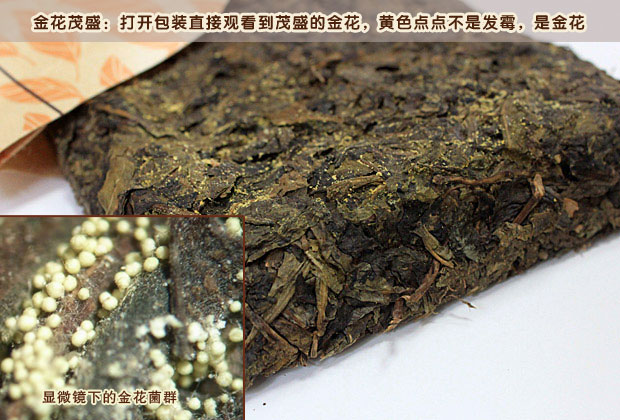 茯茶中“神秘的金花”专家觉得惊讶,并在海外畅销。“金花”也是名冠突散囊菌,黄色颗粒状,在放大镜下观看时更显著。是安化茯茶特有益生菌种,俗话说“金铂金不如黑金”。
