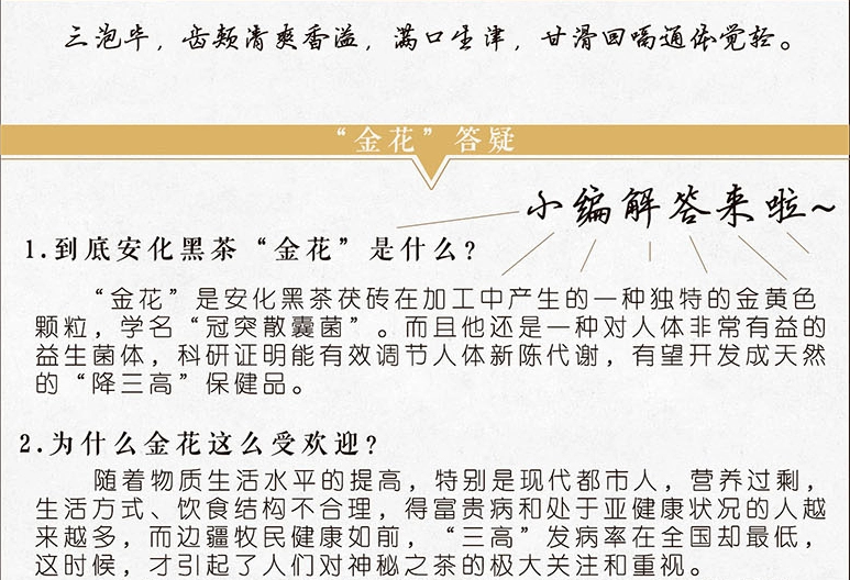 在新疆,内蒙,青海和其他茯茶主要消费地区展开的流行病学调查说明,长期饮用黑茶对人体的血脂,血糖,血压和血管硬化。不错地调节体重和体态。