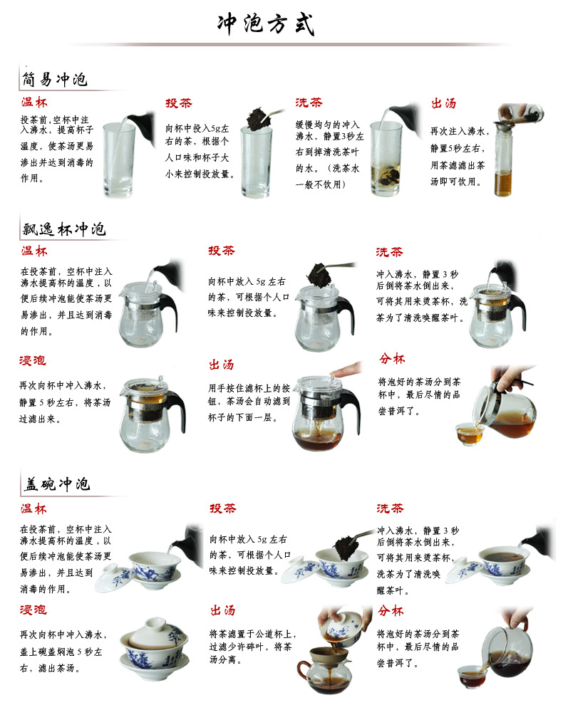 2.冲泡时使用的茶量约为5-10克,最好是95-100度的开水。冲泡时间1-3分钟,留意汤的色调,如红色