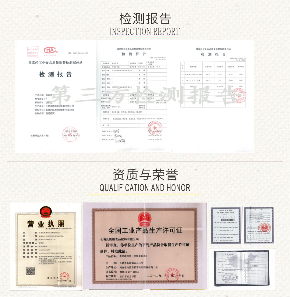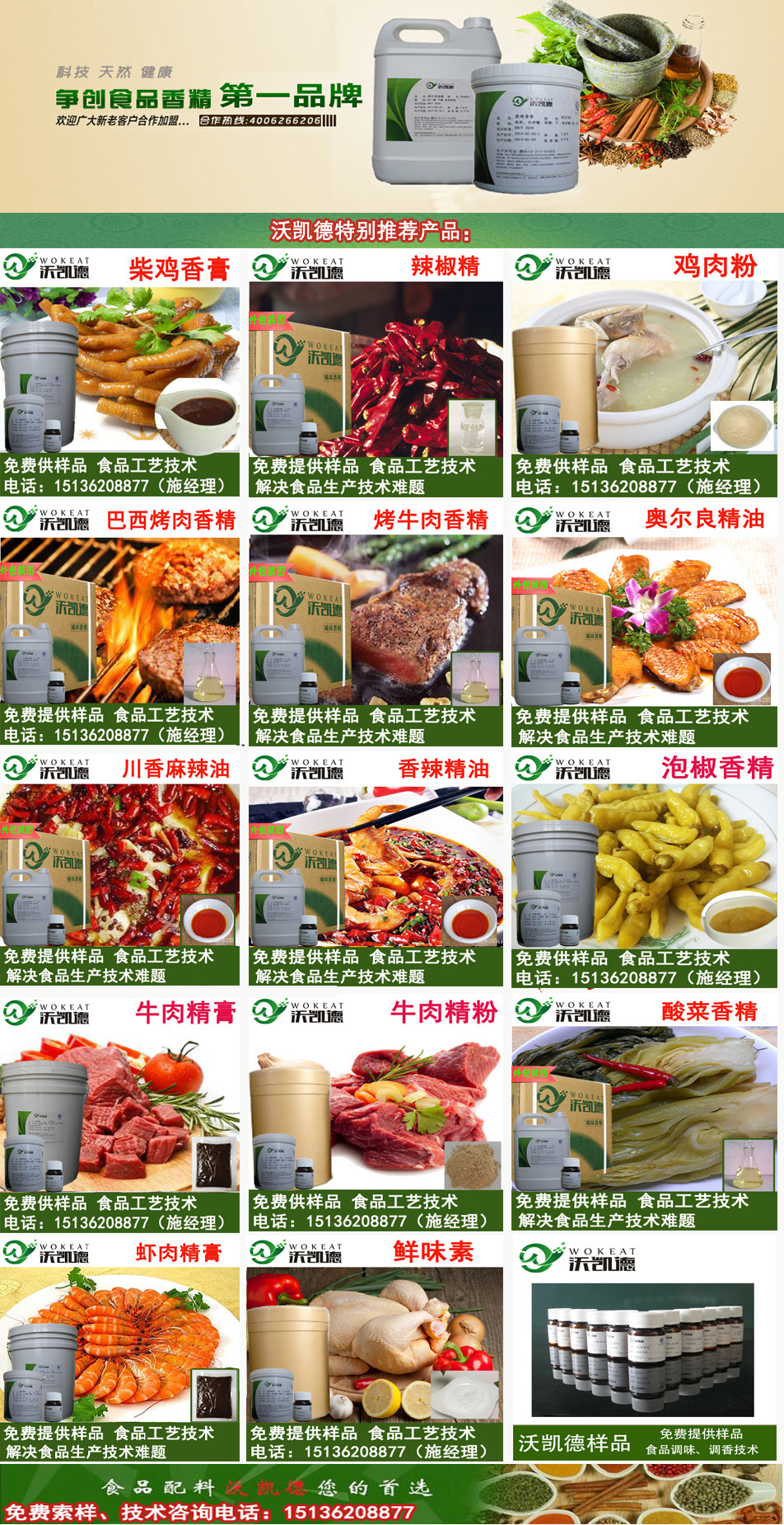 沃凯德食品配料有限公司专业生产和研发美拉德reaction型咸味食品香精,特别是高品质产品:柴鸡油膏,泡椒香精,香辣精油,辣椒精,川香麻辣油,巴西烤肉香精,奥尔良精油,红烧肉香精,烤牛肉味,肉精油,老坛酸菜香精,辣椒精,牛肉精膏,虾肉精髓霜,鸡肉精