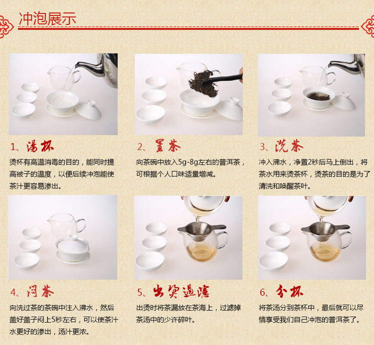 5.细心品尝普洱,饮入口,然后您才能得到确实的押韵。感觉到茶汤渗入牙齿之间并渗入牙龈。口中充满清香。花蜜“产生液体”,清爽持久。渴了,这是普洱最好的感觉到“huiyun”。