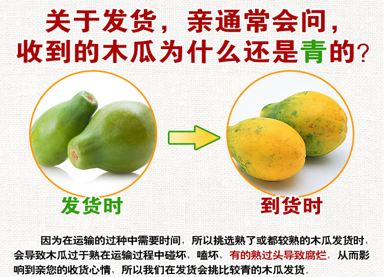 3.全熟木瓜的保留期很短,因此我们会将其送出6-7个成熟期。收到时可以食用,也也许需2-4天。