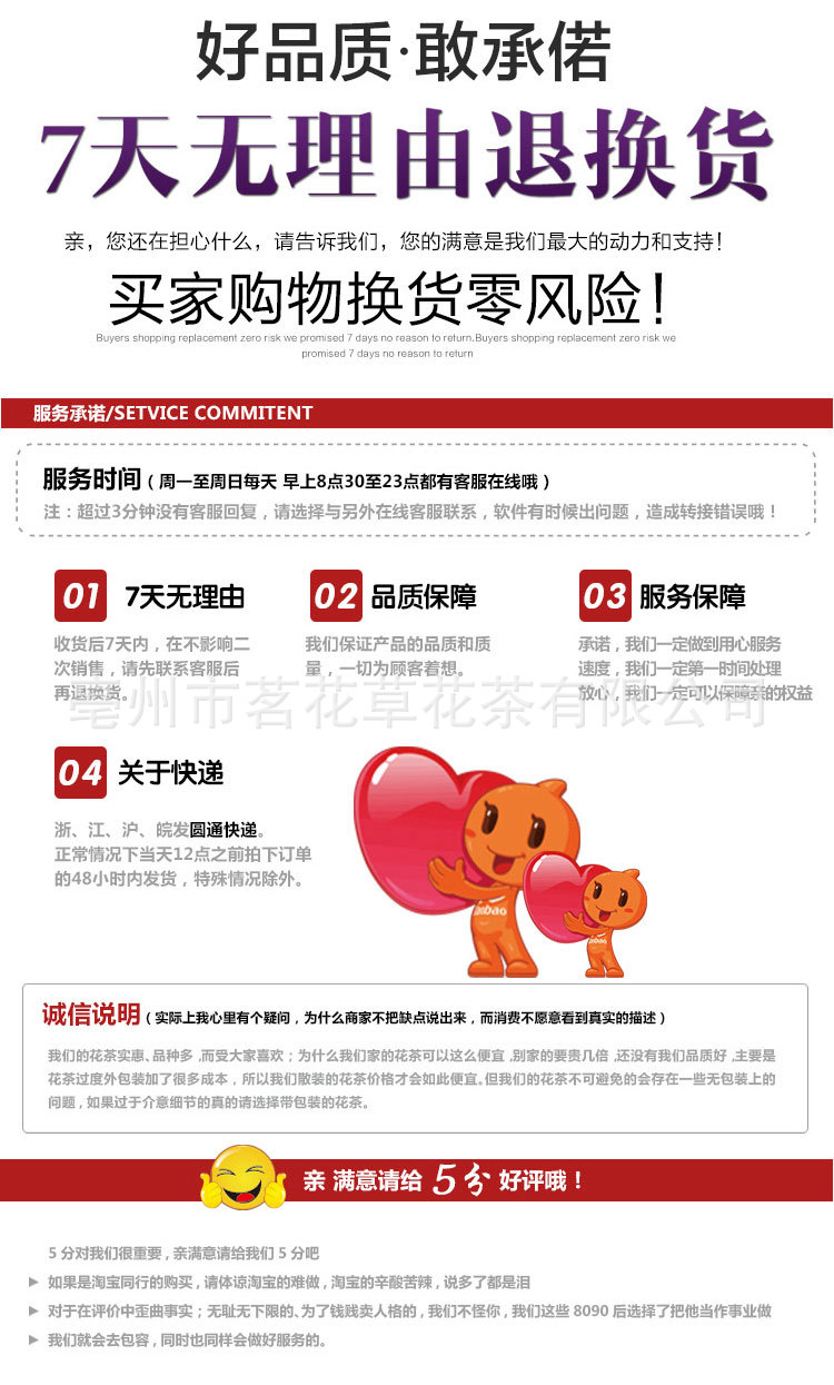 我们赞同7天无理由退货,质量有问题的卖家承担退还运输费,由买方承担非质量问题的票价(注意:收到包裹后请马上检查包裹)。如有质量问题,请在签定后两天内与我们关联,否则我们无法确定质量问题是根据买家还是买家交货。)