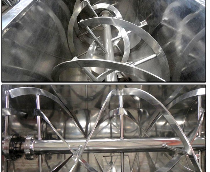 卧式螺带混合机由一个u形器皿,色带混合叶片和传动组件构成;带状叶片通常由双层或三层制成。外螺旋将物料从两侧收集到中心,而内螺旋将物料从中心收集到中心。两侧输送以形成对流混合。螺带混合器对粘性或粘性粉粒体的混合以及添加到粉粒体的液体和糊状物料的混合具备不错的效用。气缸盖可以做成一个全然开启的门,以便于清洁设备。更换产品。