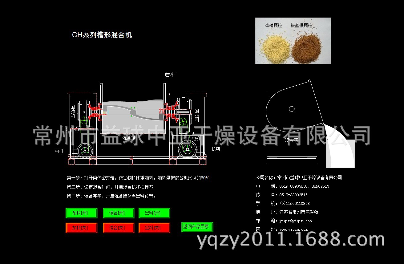 用以混合粉状或湿物料,使不同百分比的主辅料均匀混合,机械与物料的接触使用不锈钢制成,叶子与料筒的空隙小,无死角在混合中。搅拌轴的两边装有密封设备,以预防物料逸出。料斗由按钮支配,使卸料便利。普遍用以制药,化工,食品等行业。