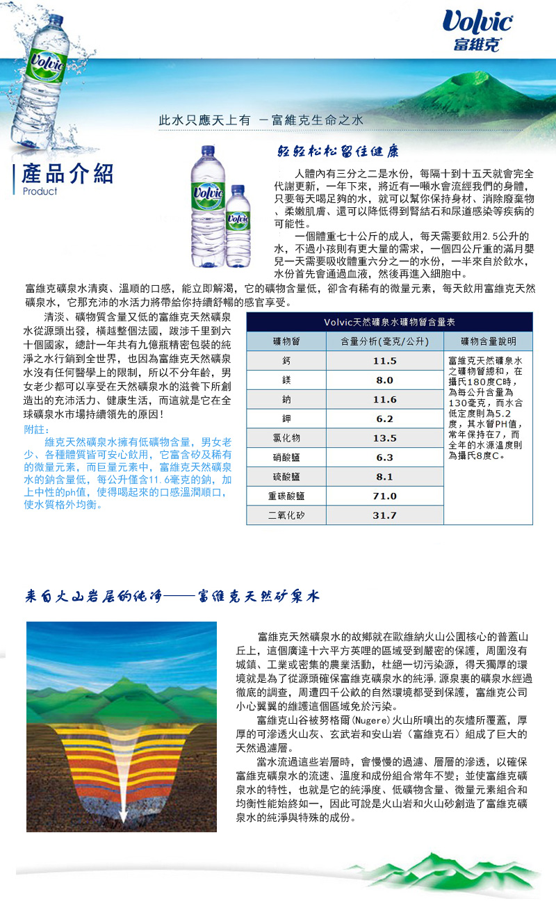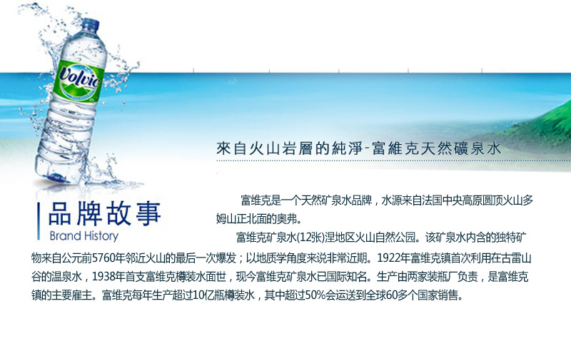 富维克是天然矿泉水品牌,水源来自法国中央高原圆顶火山多姆山正北面的奥弗