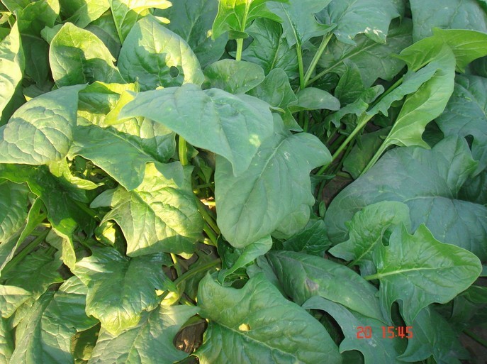 (4)荷兰菠菜。该品种早熟,耐寒,耐抽bolt,有大叶子和深绿色的叶子。每株植物的平均重量为600克,每株植物的最大重量可以达到750克。每亩平均产量为3000-3500公斤,纤维少,味甜且不涩。保护地的生长期为30天,空地的生长期为50天。秋季播种时间一般在9月底之前,从元旦到春节都可以使用,单产每亩3500-4000公斤