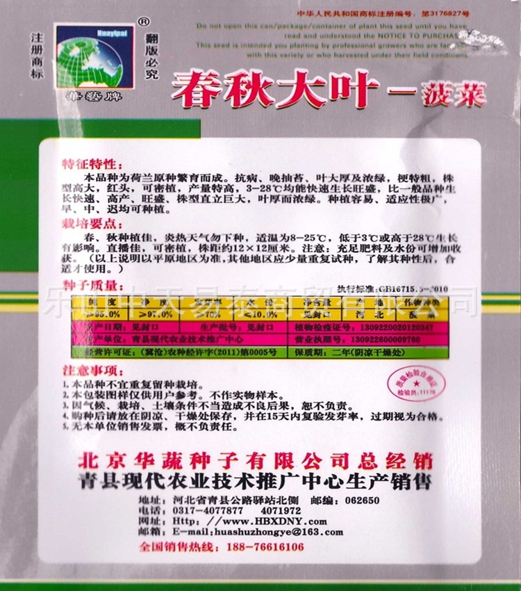该品种由荷兰原种培植而成。抗病性强,抽ing较晚,叶子大而深绿色,茎粗,植物高大,红头,可以密植,高产。它可以在3-28°c下迅速而有力地生长。与一般而言品种相比之下,它生长更快,生产力更高且精力充沛。形状直立且极大,树叶厚而密,绿色,容易种植,适应性广,可早,中,晚种植。