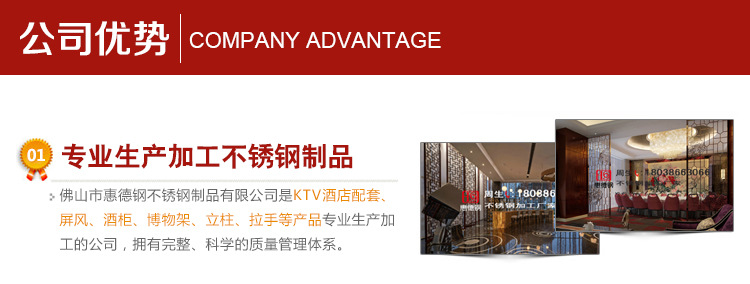 佛山市惠德钢不锈钢制品有限公司是一家专门从事KTVhotel配件,屏风,酒柜,博物馆框架,立柱/拉手等的生产和加工的公司。它有着完整而科学的质量管理体系。