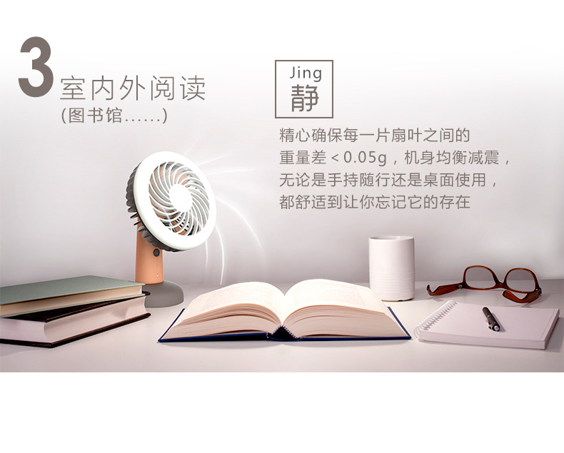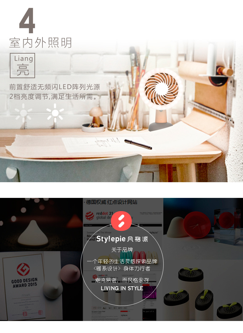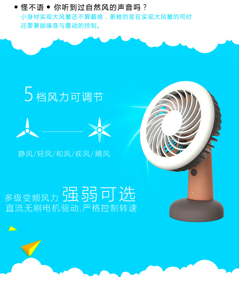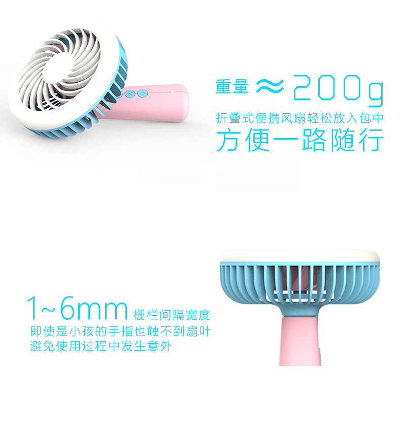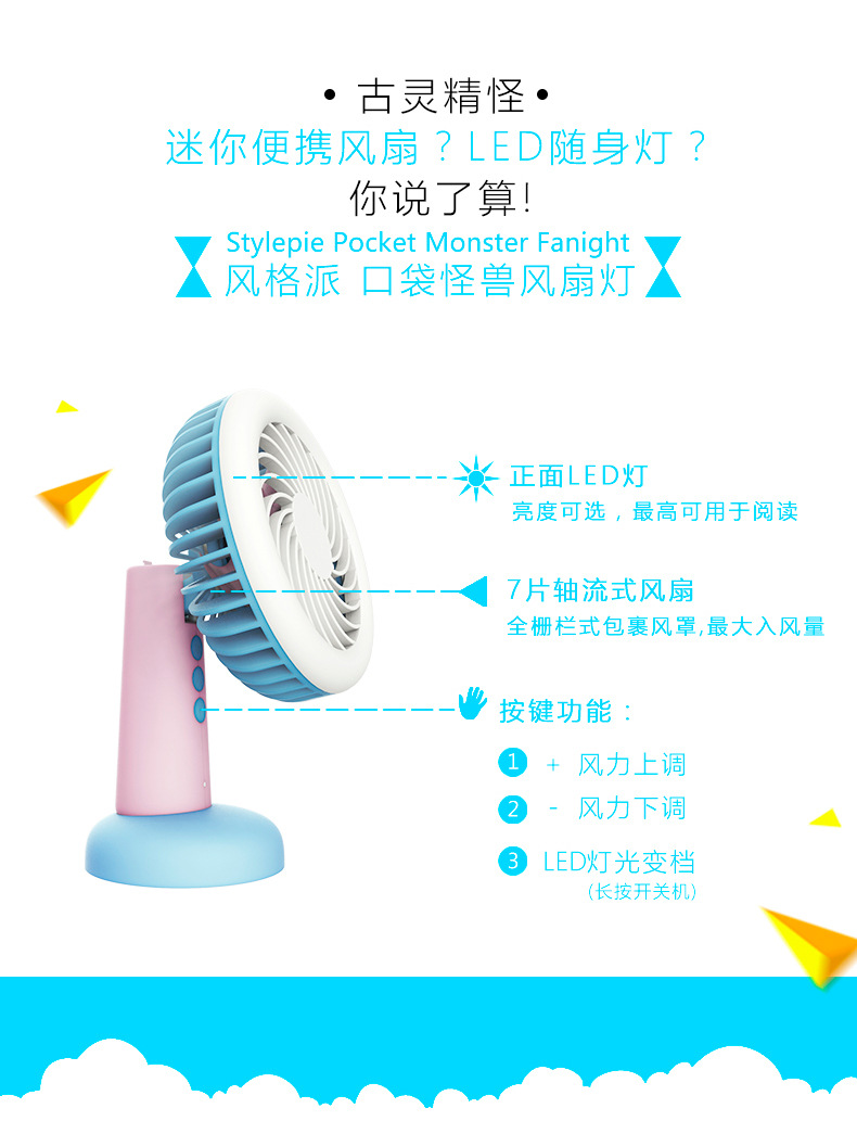 特性:led二速亮度调节,五速风速调节,造型迷人,容易充电,携带便利,超静音设计