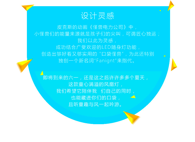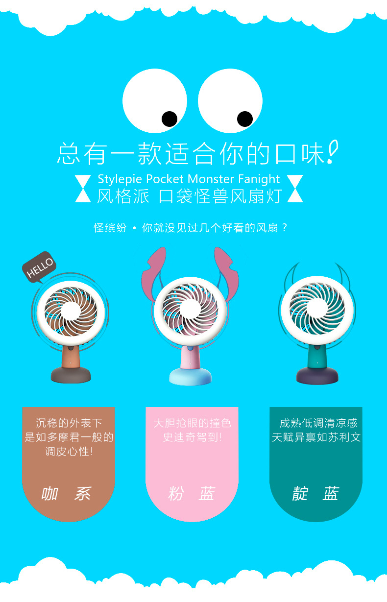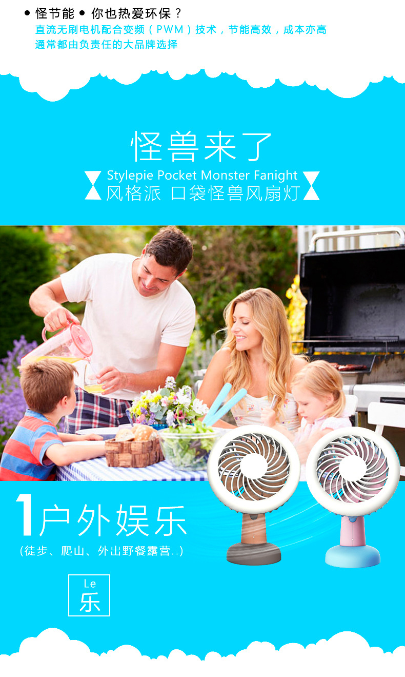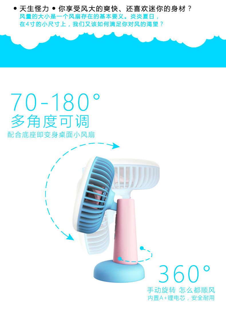 特性:led二速亮度调节,五速风速调节,造型迷人,容易充电,携带便利,超静音设计