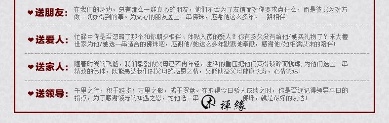 自我教养和养分-菩提子本身是佛教大家庭的神圣对象,它可以驱邪,避祸,增添智慧,带给人们和平,吉利,财富和身心健康。越来越多的人开始爱好戴由菩提或各种配饰制成的念珠。佩戴串珠不仅雅致,别致,美妙,而且修身养性
