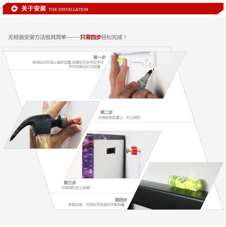 [安装方式]使用冲击钻在墙上打一个或两个小孔,然后使用塑料卡扩展套筒打孔,拧紧卡扩展套筒上的螺钉,然后通过将挂钩安装在图片上去悬挂图片将其放在墙上后,您也可以直接使用美术的内部框架将其挂在墙上的螺钉上。