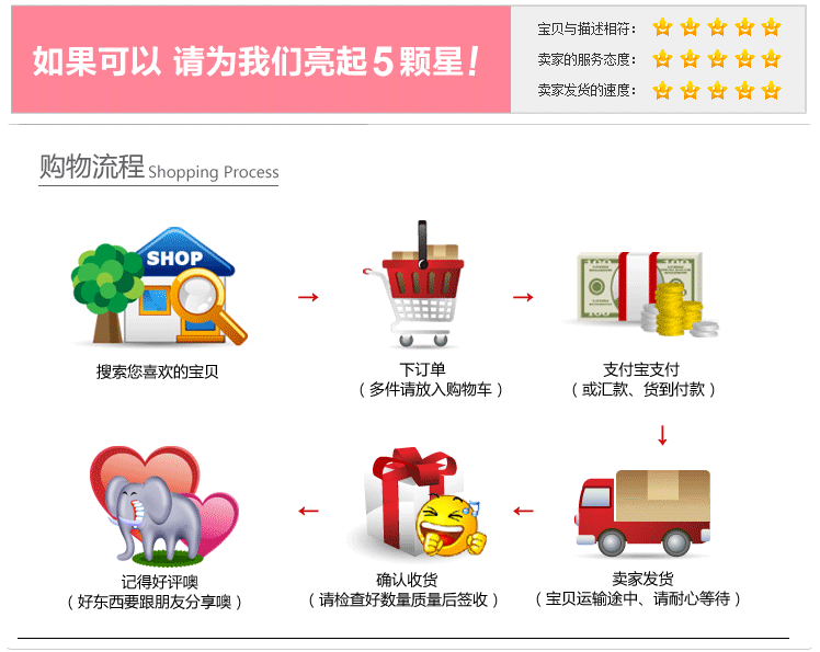 关于交货:买方下订单并付款后,我们将在48小时(两天)内发货。基本上,如果在下午4点之前下订单,则货物将在当天发货。(星期日除外)如果碰见短缺,我们会通过电话机或旺旺与您联系。人员检验发票和货物,查核正确性后,对发票签名并包装和运输货物。