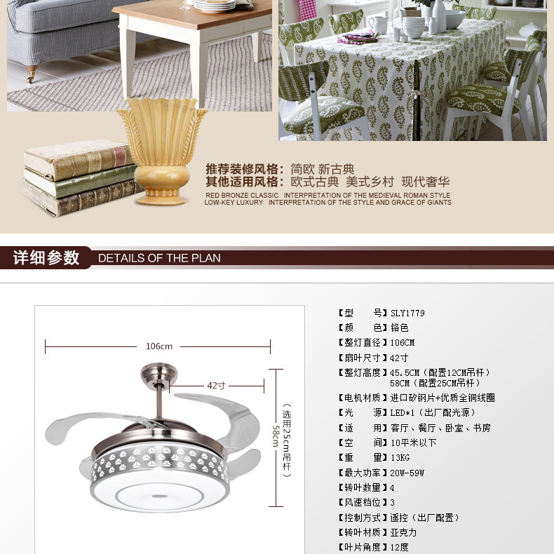 我们的店铺专门经营吊扇灯已有多年历史。尽管我们的产品有点贵,但是我们有完整的售后服务系统。我们大胆做出独家承诺:100%纯铜芯电机的冒牌货价位为10,电机的十年保修,以及更换电机故障维修的开支!