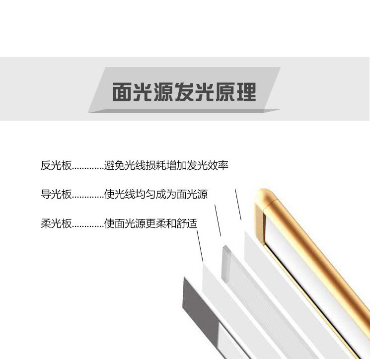 *面发光法则-LED光源从道光板向周围发光,通过反射镜折射,柔光板使强光更轻柔,从而达到保护双眼和舒适的功效,并且能量更多-节约以避免光损失。