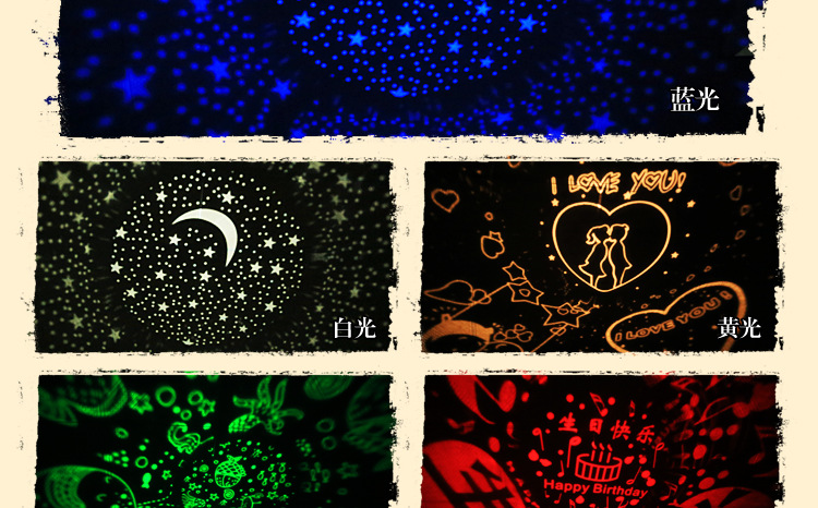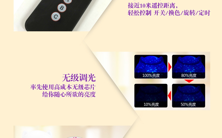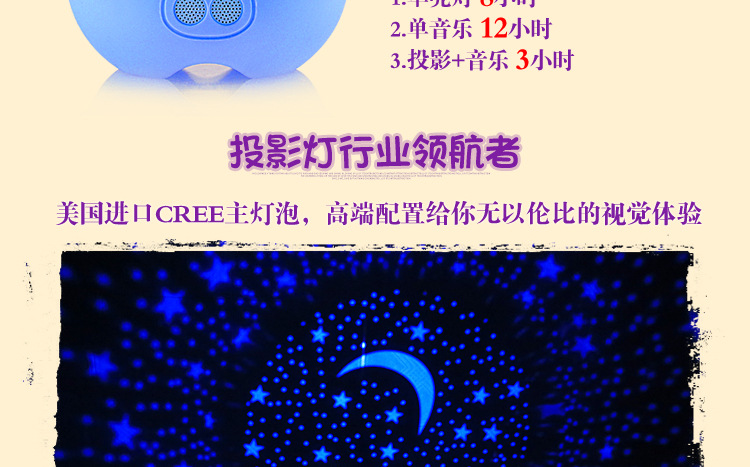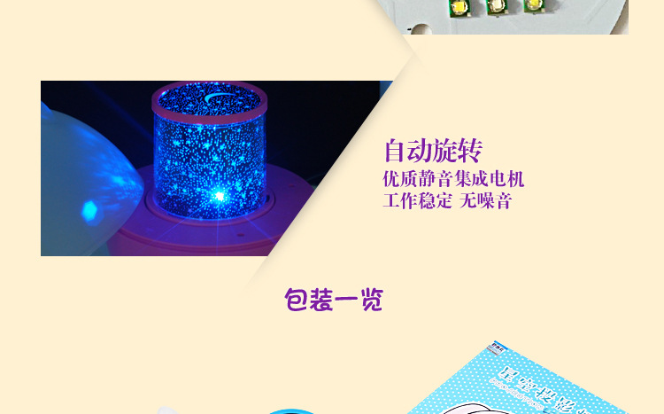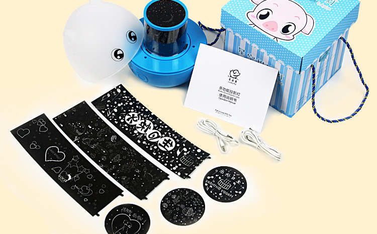 产品配置:第二代爱尚猪投影灯,1.2m充电线,1m音频线,一张中英文手册,四张投影图表,一台遥控器。