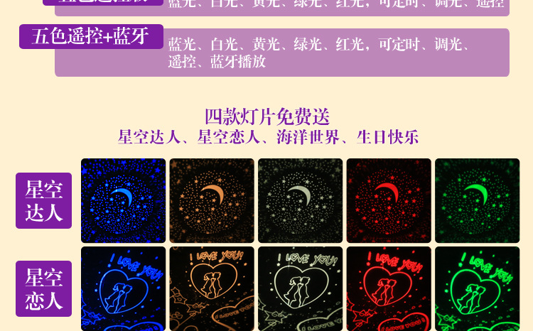- 灯光颜色三色遥控版,五色遥控版,五色遥控+蓝牙