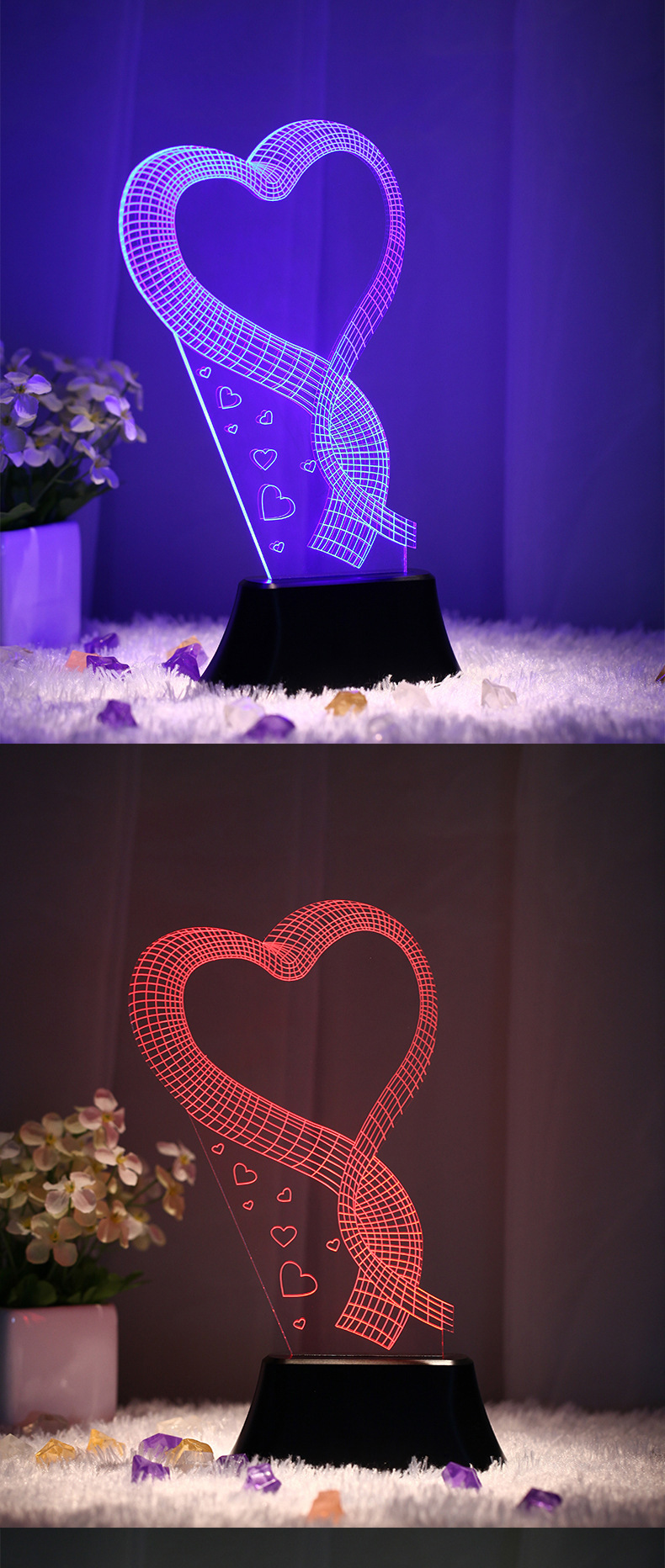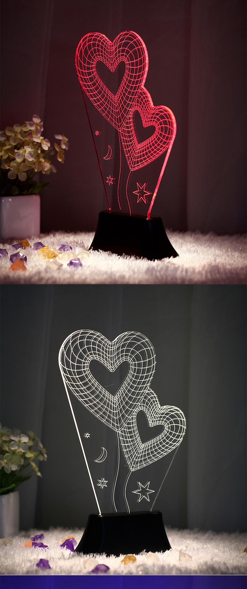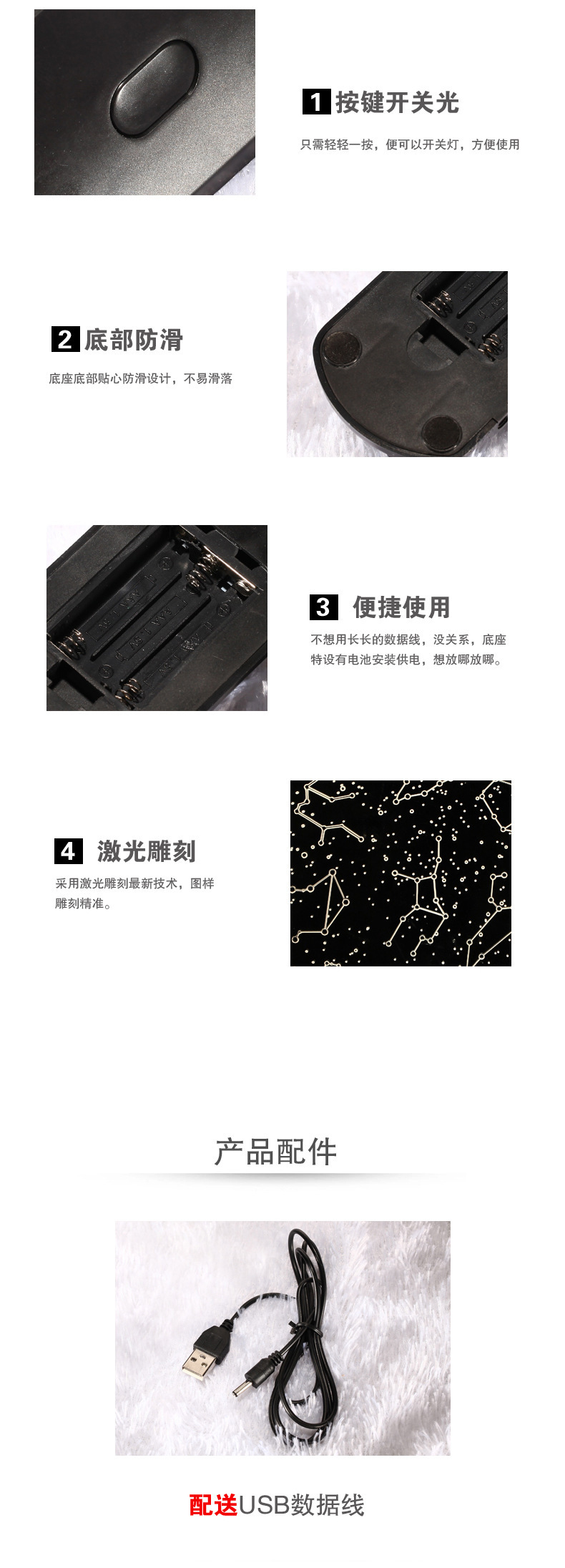 产品详情:新推出:根据您的喜好开展更改,一个有着8种功能的底座,n种多色更改,按一次,暖色,再按两次:红色,第三次:白色,第四次:蓝色,还有更多...第八项功能是7色光周期渐渐消亡。在每一个灯下,常常按可以关闭,按一次可切换到另一灯。给您整个星空的爱,暖和的灯光