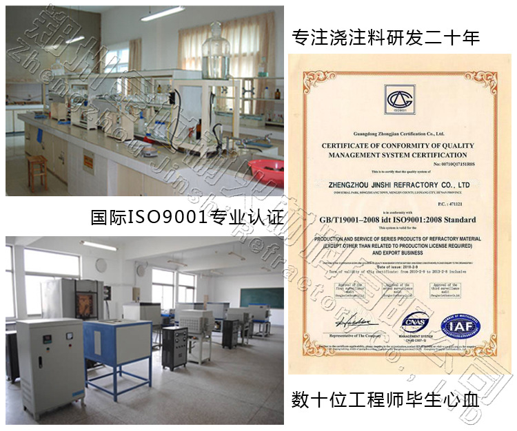 特性:使用低水泥胶结技术,添加超微粉和高效分散剂,强度高,热稳定性不错,耐冲击,耐腐蚀,耐磨损,使用寿命长。优良的材料选择,浇注料的耐火度可达1790℃机器混杂,浇筑施工,喷涂式可机器半干法喷涂施工便利,大大缩短了工期,兼具显着的经济效益。用处:水泥窑预热器lining,管道衬砌,冷却器衬砌,煤炭喷枪敷料,前后窑口,冷却器和其他高温部件。可以预制成各种基准和尺码的预制块,也可以喷涂(预热器衬里)用法:加水并搅拌入砂浆中并振动浇筑或制作各种种类的预制块,喷涂种类可半干喷涂施工