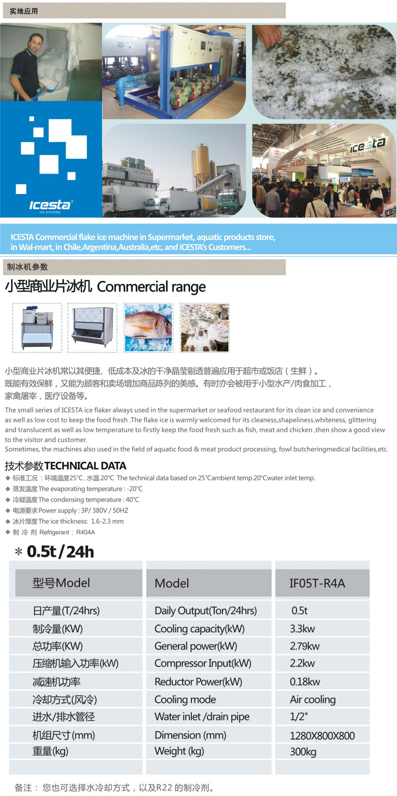 ICESTA冰机系列包括片冰,管冰和块冰。它已通过欧盟ce安全规格,日产量从500kg到60吨不等。它普遍用以百货公司,酒馆,酒吧,水产品和肉类加工,家禽宰杀,皮革制造,化学染料,矿山,混凝土建筑物,诊疗装置,大洋捕捞,人造滑雪胜地等行业。