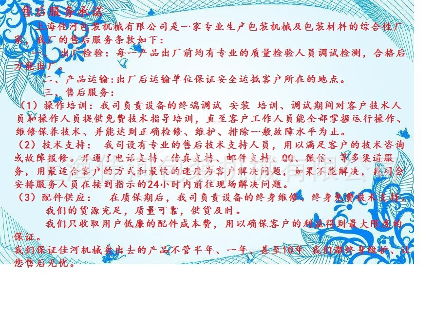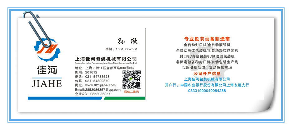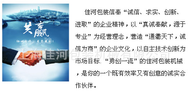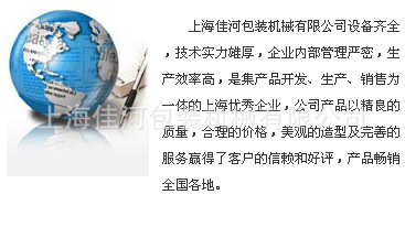上海佳河包装机械有限公司座落中国经济中心和关键的港口城市上海。该公司是一家专业从事包装机器研发,生产,销售和服务的现代化企业。该公司的主要产品有:真空机,封口机,收缩机,灌装机,包装机,打码机,喷墨印刷机,杯盒盖机,泡罩机,贴身机以及10多个系列60产品品种繁多,产品普遍应用于食品,保健品,医药,农药,化工,玩具,日用化工和五金制品行业。并根据客户要求,根据客户要求定制产品,以满足市场需要。同时提供包装装置中采用的各种消耗品。公司坚称“质量取得市场,服务铸就品牌”的规范,受客户好评和信赖。该公司的产品不仅在国内市场上畅销,而且还远销全球各地。