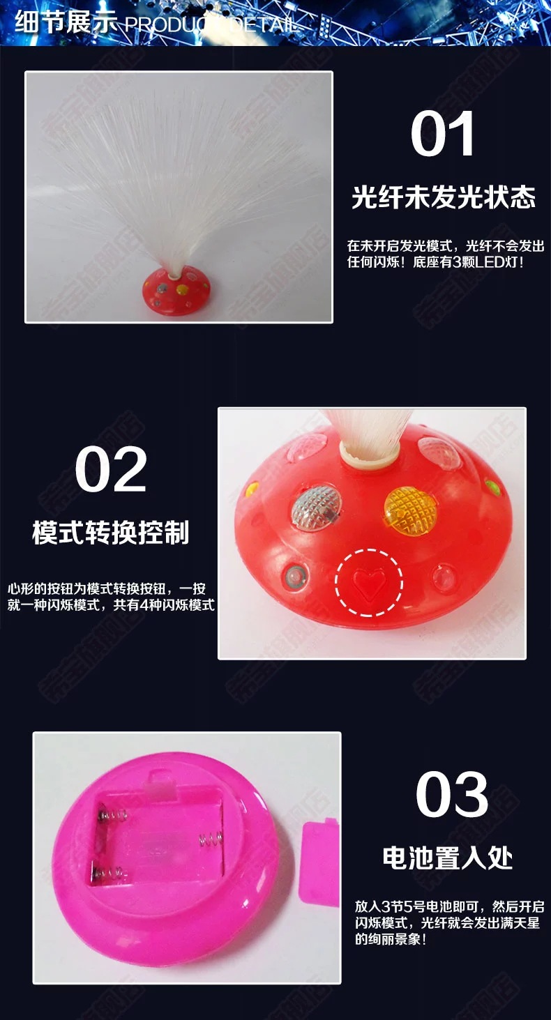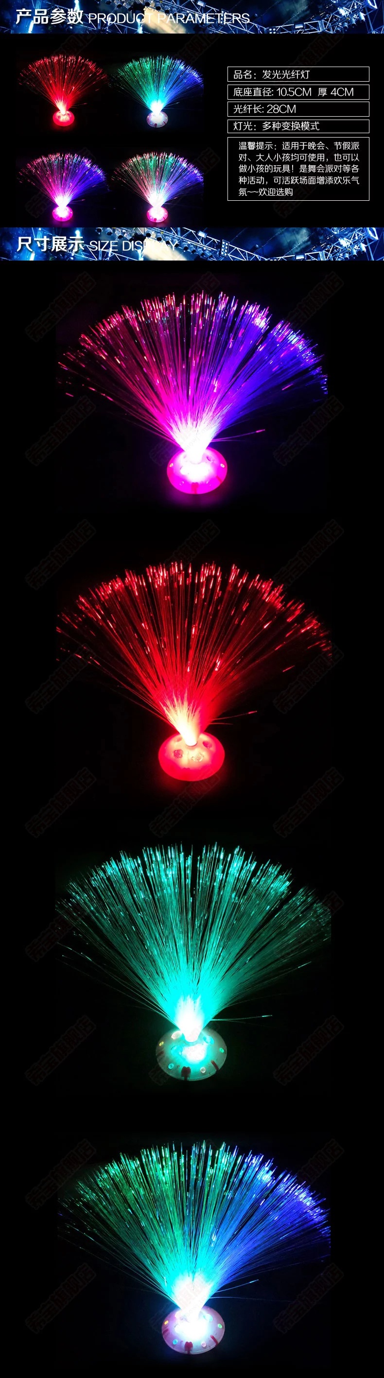 使用方式:最新的高科技研发产品,光纤灯,该灯由灯头和光纤构成,运用光纤导光的法则可以使光线丰富多彩,充满活力,可以像闪烁一样消逝天空中的星辰,它可以像烟火一样绽放和绽放。