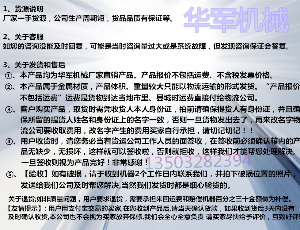 自购得之日起,保修为一年,终生保修,人造件和标准件不在三项保修范围之内。由于拍摄技术,环境强光等因素的影响,可能会有些许误差。图表与具体产品之间的色差。请参见最后产品。有关特定的运输成本和产品性能,请在线咨询或咨询。我们的工厂是生产机器,产品质量保证,现场安装,调试和免费培训的专业制造商。
