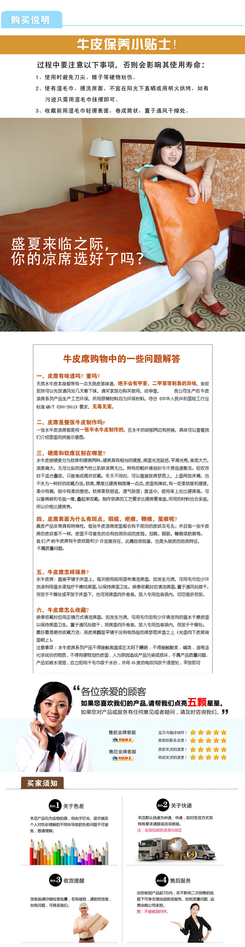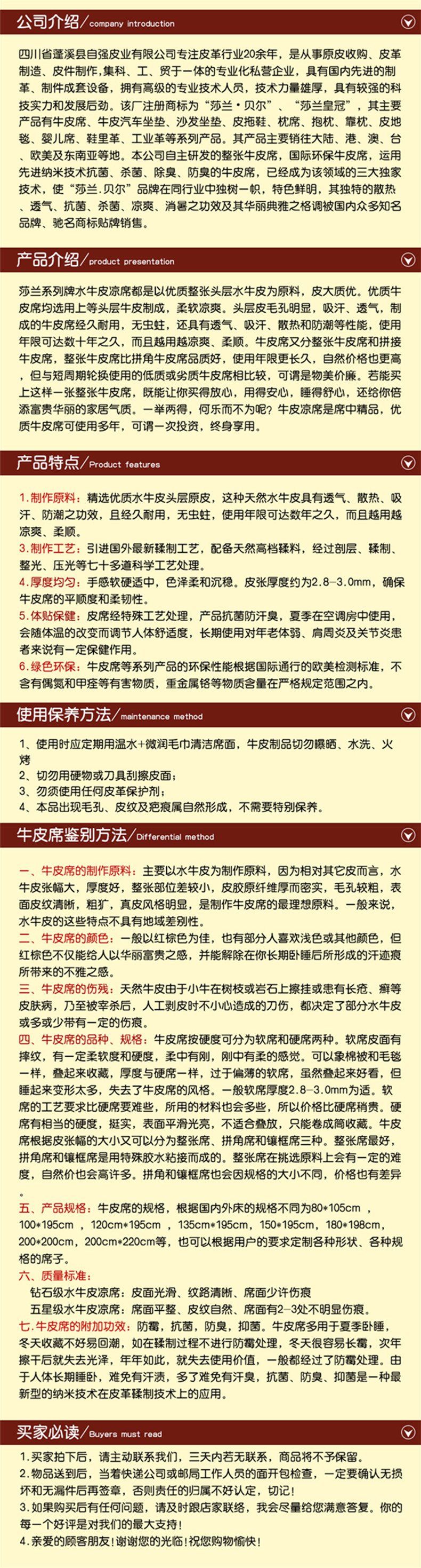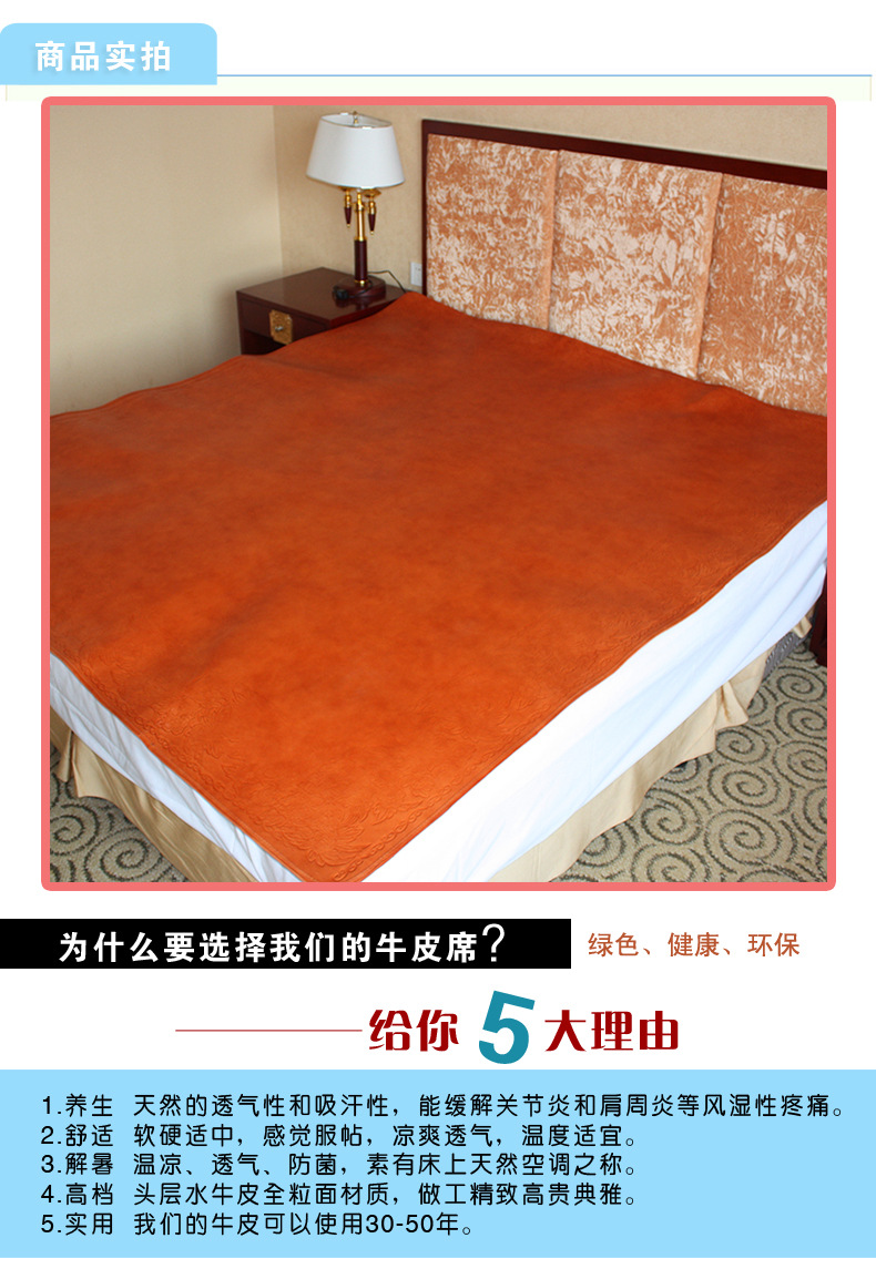 产品详情:莎兰贝尔水皮凉mat是以优质的全头层水牛皮革为原材料,以大而高质量的皮革制成,优质的牛皮垫子是由柔软,凉爽的一流牛皮制成的。皮革层兼具显著的毛孔,吸收汗液且透气。用它制成的牛皮垫经久耐用,并未昆虫。它还兼具透气性,吸汗,散热和防潮的属性。使用寿命可以达到数十年,并且使用的次数越多,降温的温度就越高。柔软。牛皮座椅分成全牛皮座椅和拼接式牛皮座椅。整个牛皮座椅的质量要比角形牛皮座椅的质量更好,使用寿命更长,自然也更高昂,但与短期转动使用的劣质或劣质牛皮座椅相比之下,可谓质量高,价钱廉价。如果您能买到这样的整个牛皮垫,就可以放心地购入它,放心使用,舒适地睡,并为您提供一个丰沛而华丽的家。用两只石块杀两只鸟,而无需何乐牛皮夏季凉席是凉席中最好的产品。高品质的牛皮垫可以使用很多年。