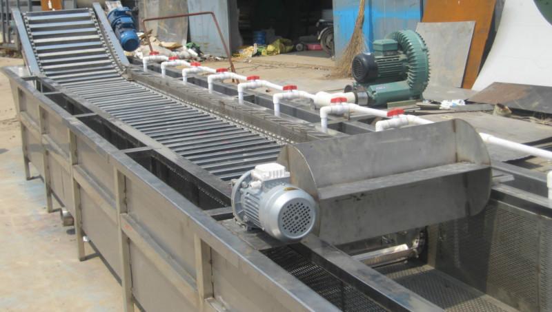 2,设备的输送带电机可以实现变速调节功用。清洗后的蔬菜通过网链输送,自动出入料,根据生产需调节输送带的输送速度;