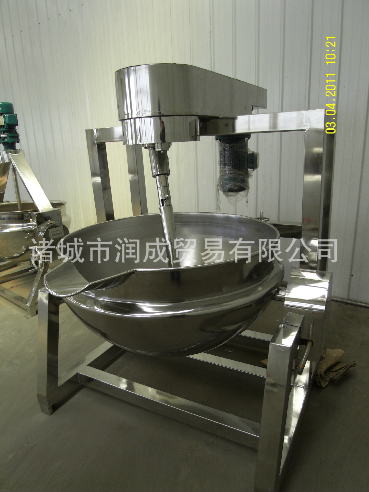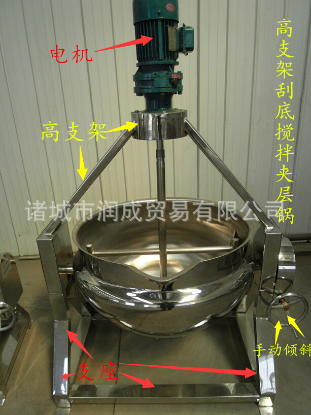 4,带搅拌设备的锅:在顶部中心搅拌,减速器的输出轴与搅拌桨的轴通过回路连结,便于拆卸和清洗。