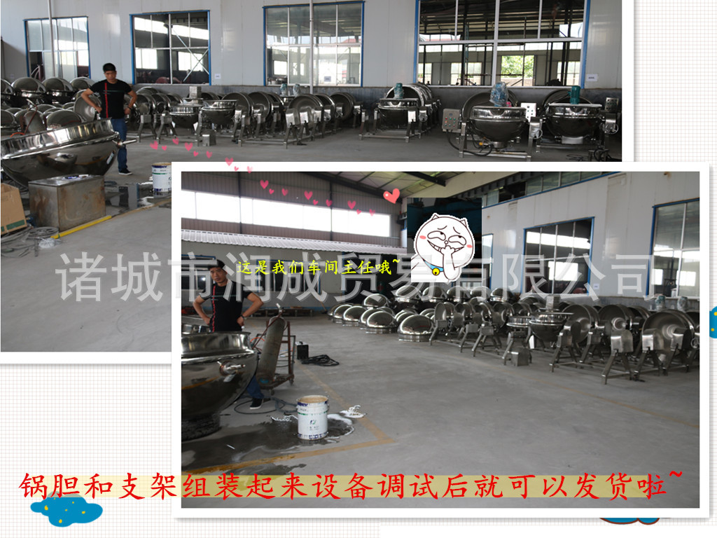 如果您需要购置food夹层锅自动搅拌夹层锅自动加热夹层锅友肉加工设备,欢迎来到诸城润成机械看看,我们的夹层锅有很多型号,很小的是75l,最大的是该设备由1000l制成,可以起到蒸和炸的功用。该设备由优质不锈钢制成,因此越发结实结实。锅体由4.0-5.5毫米厚的a3级钢板制成。当它低于2mm时,终止使用。夹层锅采用一定压力的蒸汽作为热源(也可以采用电加热),该夹套锅兼具加热面积大,热效率高,加热均匀,液体沸腾时间短,加热温度容易操纵。