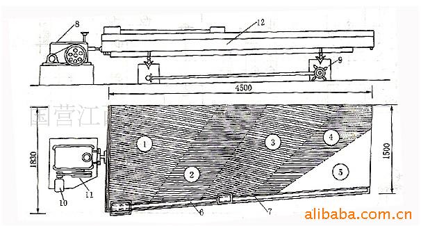 6.进料槽7,进水槽8,床头变速箱9,调坡器10,电机11,皮带飞轮12,振动筛表面