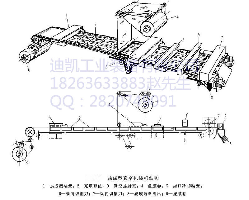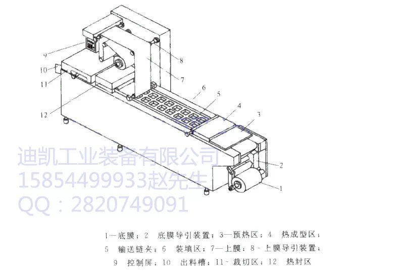 我公司生产的迪凯牌自动热成型拉伸膜真空包装机的法则如图2所示。它主要由以下部分构成:薄膜输送系统,上下模具指引构件,基膜预热区,热成型区域,填充区域,热封区域,编码系统,sub切区和侧边物料回收系统,控制系统等,整机采用模块化结构设计,可根据用户需要添加或删去各种设备增加,减小和更动各种功能。以下是设备各部分的工作原理。
