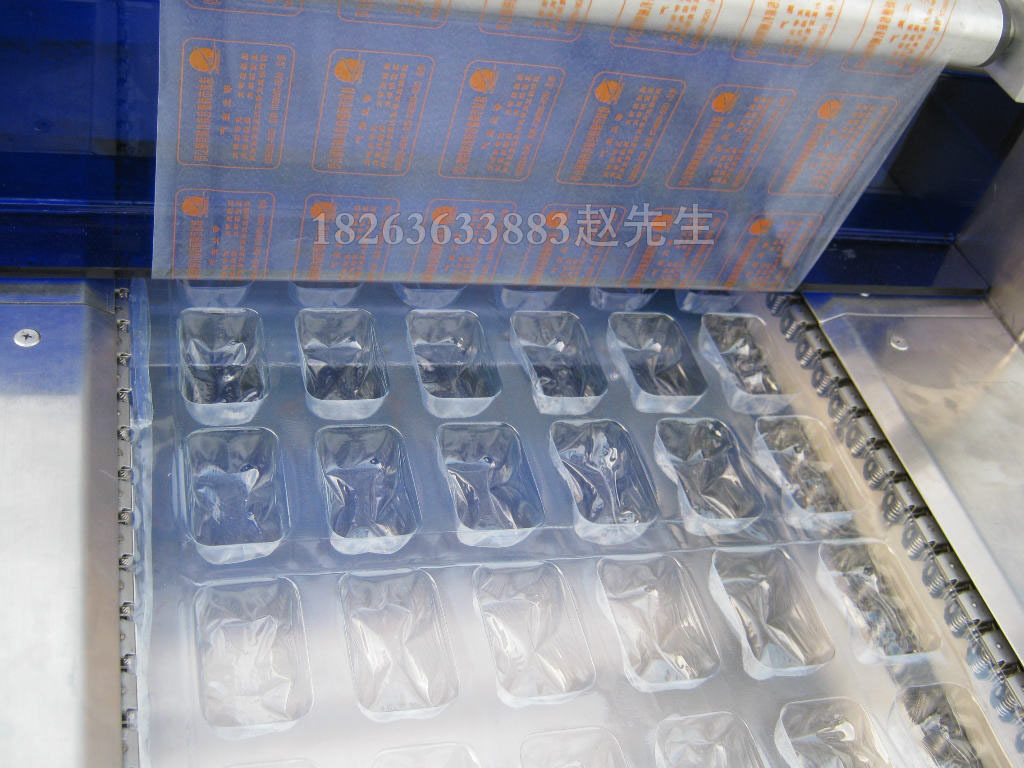 5.热封区域。当已装满物料的托盘的底部薄膜进入热封区域时,它被薄膜遮盖。热封区域配备有热封模板,该模板由空气驱动柱面。热封模板中有一个电热管,加热温度由温度控制元件控制,通过热封模板可以将上层膜与托盘的下层膜热封。电子设置温度和热封时间以适于不同厚度或不同材料的薄膜,根据需要,可以在热封区域安装真空和充气装置以实现真空或真空可充气包装。真空度和充气量可以通过电子控制装置控制。