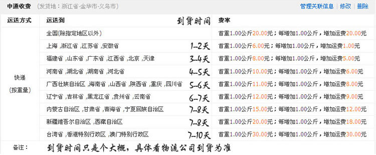 江苏,浙江,上海,安徽地区首选快递,我们公司的合作快递为申通/优速快递,并且邮资模版也按照申通快递收费标准化收费。如果有指定的快递公司,则事先收取的邮资为:公司的物流规范收取快递费,邮资则以退款较多,补偿少的规范为根基。请注意。
