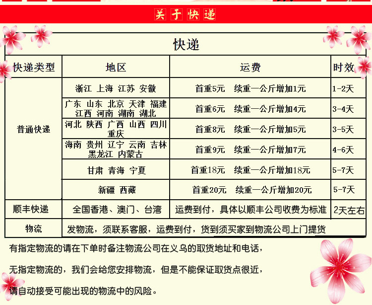 产品详情:我们的送货时间是在下订单当天的下午4点之前,在下订单的次日下午4点之后,如果金额少于500元,提议向客户发送快递费,并且金额超过500元的客户将发物流。物流运费是代收货款,货物抵达时物流公司会通电话给您,您需亲身去物流公司取货,多谢您的光临!