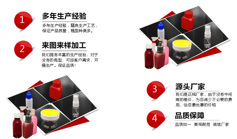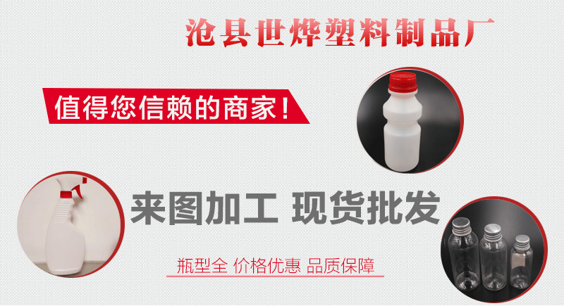 沧县世烨塑料制品厂是一家专门生产塑料包装产品的企业,并且是经国家有关部门准许和注册的企业。主要是塑料瓶,我们有多种种类的瓶,完整的瓶型和充沛的库存。对于不存在的瓶子种类,我们可以根据客户需要开启模具生产,并确保质量。该公司座落中国河北沧州市沧县杜生镇南开发区。公司本着“客户至上,诚信至上”的规范与多家企业确立了长期的合作关系。