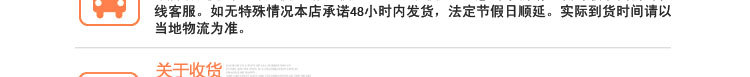 [买家必读]:1.产品图表均为实物拍摄,由于强光或显示因素,图表色调可能会稍有错误,以具体产品为准。购买前请与我们确认。2。运费由买方肩负,购买前须要确认运输方法及相关费用,以确保货物安全,按时到达买方。如果佛陀太大而无法用到快递,则只能通过以下方法运输:一家专业的物流公司,通常将货物运载到当地的物流站,您可以选项自己取货或要求送货上门,当然,您会被收取门服务物流公司的送货费用。为了确保物流公司更好的服务态度,提议仅在货物到达时才支付运费(我们会在发货前向买家确认运费,我们将在发货后立刻跟踪货物)直到物流公司通告买方取货为止)3.交货期:一般在2天内发货;从未库存的产品通常在到货后10天内付款,现在制造的产品通常需7-10天的生产周期。广东省内的交货时间通常为1-2天,偏远地区为3-4天;在其他省区送货5-10。实际到达时间因地区而异。我们会在发货前与物流公司确认,并为买家的运输过程中做好跟踪服务。4。检验验收:买方在收到货物时应精心检验货物的外包装是不是损坏,特别是树脂制品,佛像,祭品等产品(当场签收,我们认为买方并未反对产品的完整性!)如有必要,您可以敞开包装并当场检验。一旦发现货物有任何损坏,请适时拨打我们的服务对讲机,以化解疑问。我们不期望买家在装货时发现运输途中导致的损坏。在家里,所以我们不便向物流公司索赔。5。退货和换货:在本店购买任何产品后,如果收到货后发现质量疑问(非人为缘故,无法采用),需退货,确认后我们将无条件接纳退货和换货,并且负责相关费用。
