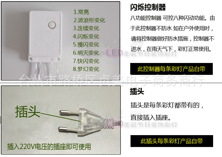 机能:该型号为防水网灯,带尾插,可任意联接多套ip44八功用控制器。容易用到!