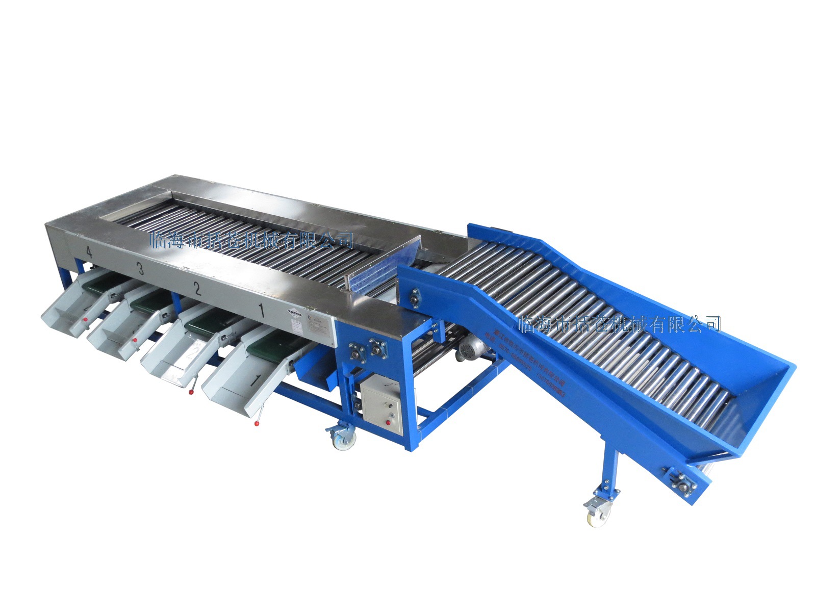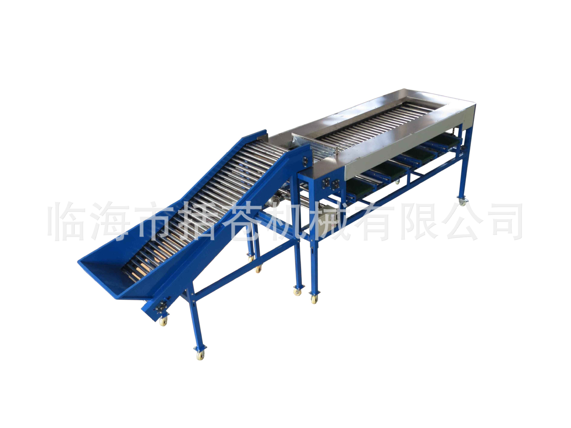 该装置是果蔬分选机,由水果输送平台和分选机构成。