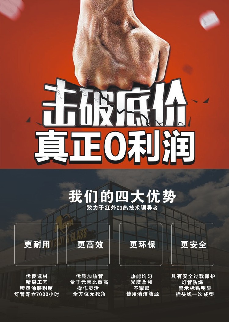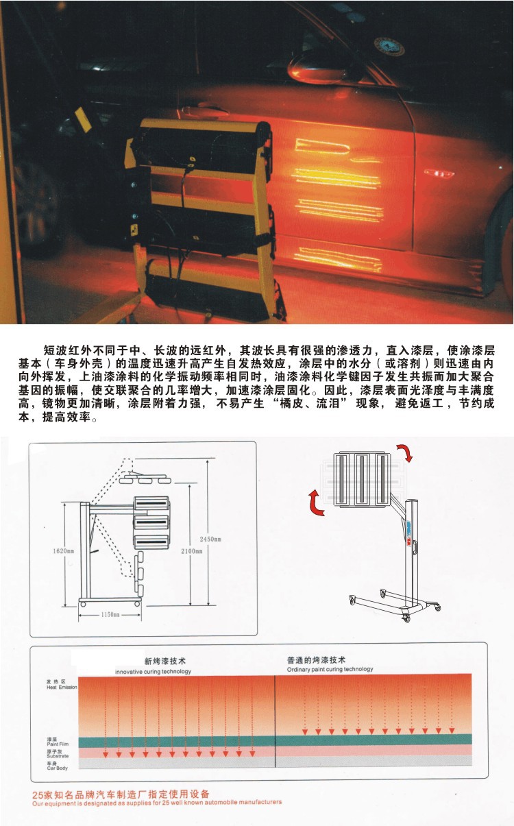 Generallyspeaking,the higher the temperature the shorter the wavelength produced. The different between the three types- long,medium andshort,isin the depth of penetration through the paint film (in automotive applications) and excitement of the molecular structure. The advantage of using infrared is that only heats objects that are placed in its path, directly focusing energy where it’s needed. Infrared equipment causes molecular excitement both in the paint and in the substrate wich in turn causes heat to pass back through the coating via conduction. The use of shortwave infrared is in fact triggering a two way curing using radiated energy from the surface and curing. Shortwave produces high temperature that dramatically accelerate the curing / drying process,unliketraditionalmethod, the cured paint could not be skinned trappng solvent that will produce sovent pop ( a pinhole effect) to the finish. Another benefit is that infrared is much more efficient than convection,and it is this combination of fast , high quality curing with low running costs。