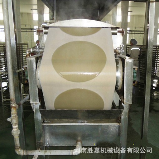 由微机操纵的成型机将圆形面团直接喷在传送带上,然后通过蒸锅将圆形面团蒸成圆形面团,从而生产出从未任何角废料的圆形面团。
