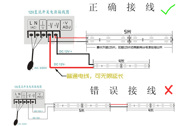 提议一根灯带不超过5米。如果长度为10米,则最好将每个灯带分离5米,然后将两个灯带与电源串联。