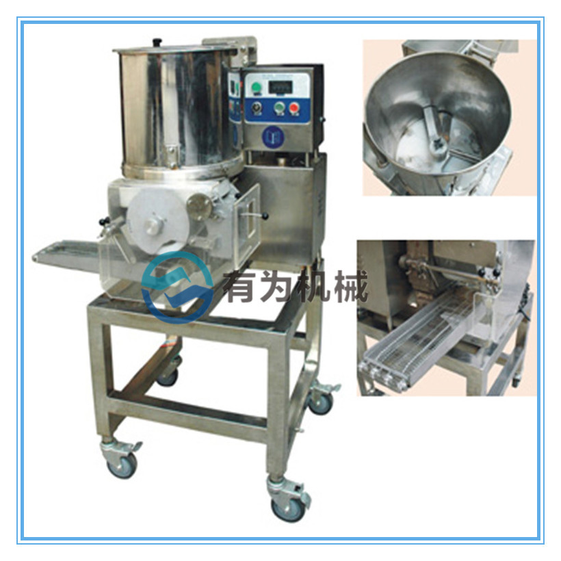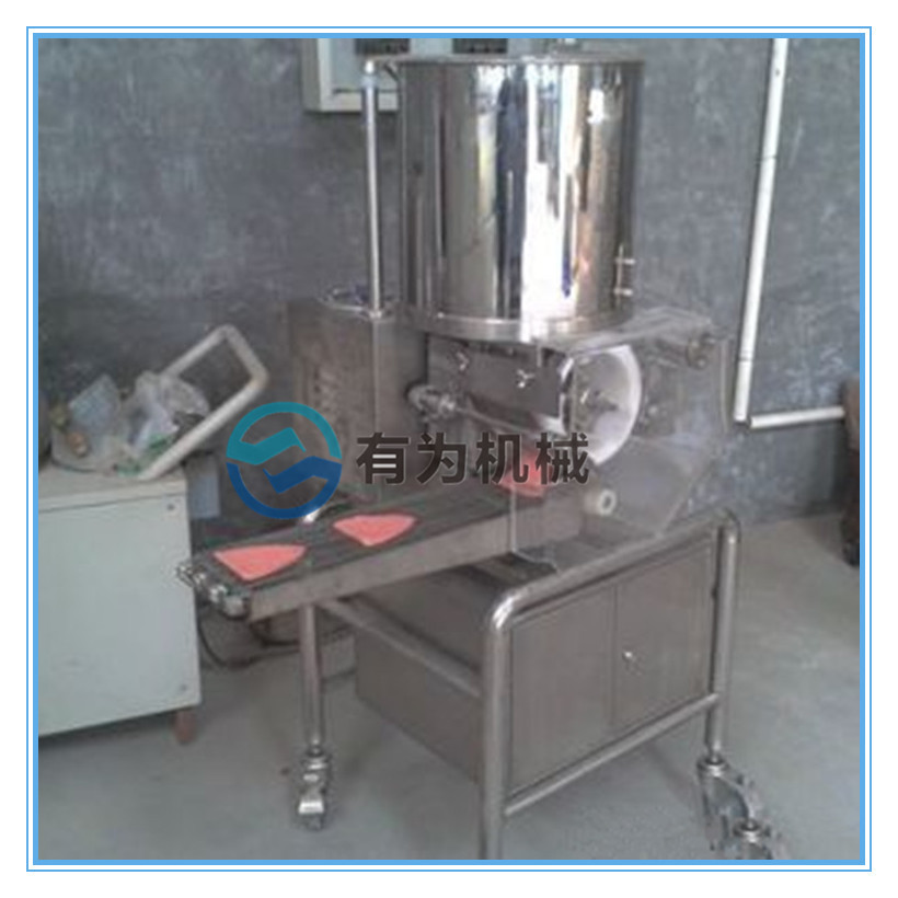 自动肉饼成型机可自动完成圈套的填充,成型,粘贴(可选),输出等工序,可通过更换生产不同形状(圆形,正方形,椭圆形,三角形,心形等特别形状)的产品不同的模块。