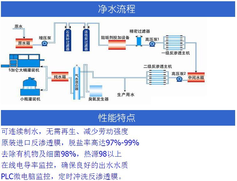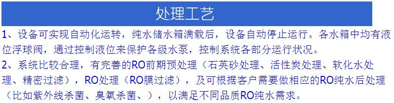 2:预处理-初级反渗透-次级反渗透(正电荷反渗膜)-纯净水箱-纯水泵-紫外线灯-水位