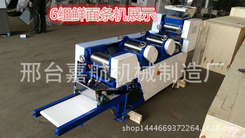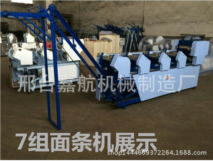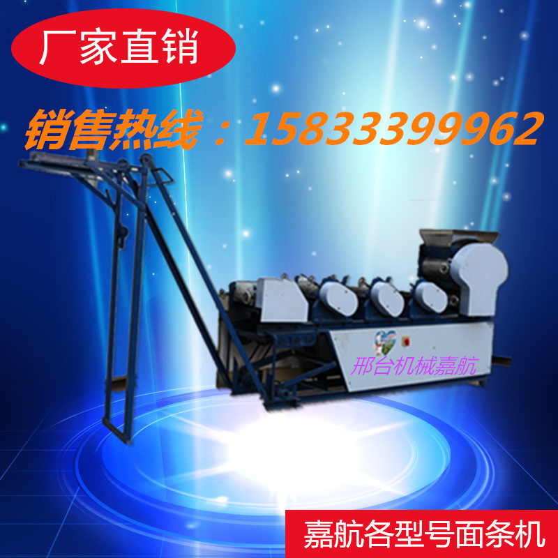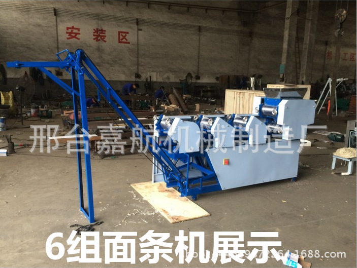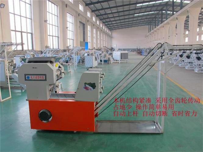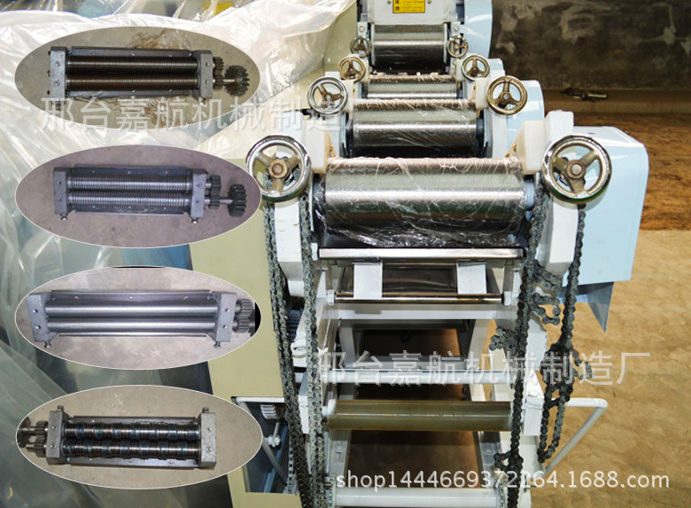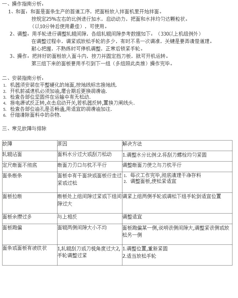 安装指南1,机器安装须要固定平坦,打开侧盖,在减速器中加30#油,接地线按地线标示2。检查运输过程中各部分的紧固件是不是松动;3。连通电源,测试正转和反转,在正常情形下,按下上部三角皮带,然后拧紧马达护罩4。检查工作部位的油孔是不是畅通无阻,并在加油后启动操作指南。1.捏合:捏合是面条生产的第一步。将面粉放入面条搅拌机中开始搅拌面条,按规定比重约25%加水,启动电源,将面条和水均匀搅拌成颗粒状(10分钟后最佳使用),即可用过的2。调整:用到手轮调整轧辊间隙。每组辊缝的参考数据如下:(330以上的机组除外)。在调节过程中,拧紧或松开手轮多少,有时不易一次调节,关键是找出实情,耐性掌握,如果不纯熟则终止机器调节并锁定正常后手轮3。操作:将混杂的面粉放入面条机中,按刀并固定刀板,然后将其打开。第三组专家组应手动指引到下一组(多个组等)。常见故障和故障排除