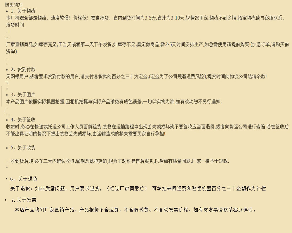 1.关于运费:本店货品价钱不包括任何运费,税金,调试和安装费,是机器的出厂价格。由于交货方式不同,交货地点不同,一般而言物流和快递的价钱不同,到各地的运费也不同,因此本店将根据买家的送货方式和收货地点确定运费,以确保最后交易价位。