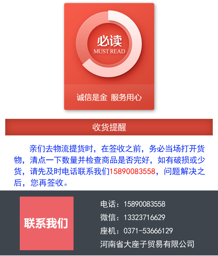 3.关于物流:产品默认发货,运费一律代收。如果需发快递,请联系在线客服。如果客户有指定物流,请告诉客服物流公司地址,称谓和电话号码。